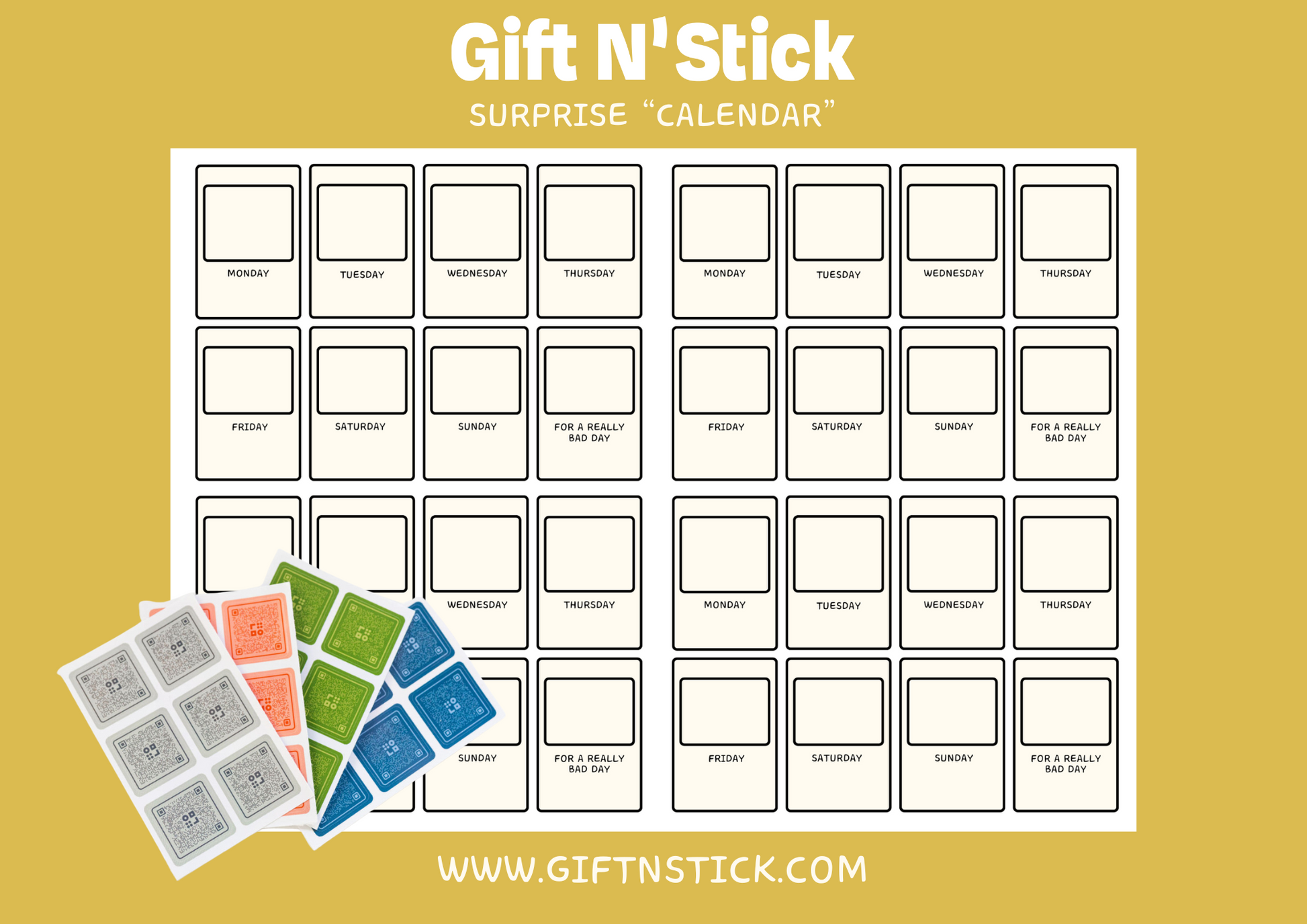 With the Surprise Calendar, you can surprise your loved ones each day with a message. From a good luck with for work or an exam, to counting down to that trip you're all waiting for. Download this free template now and make sure to order some stickers as well!